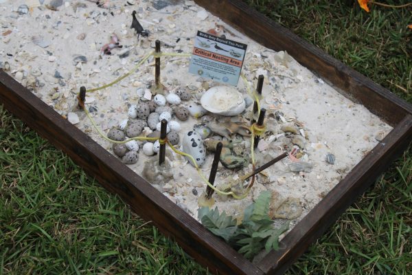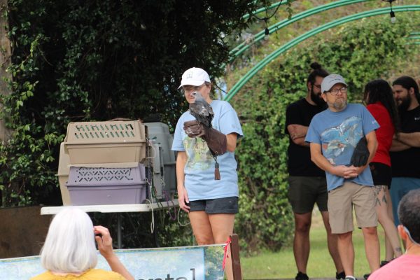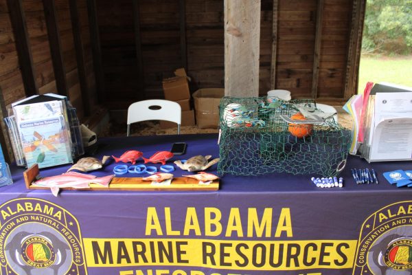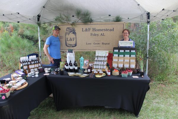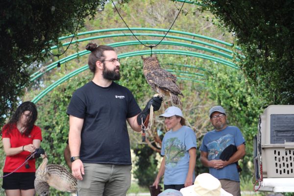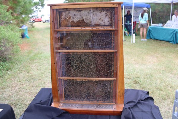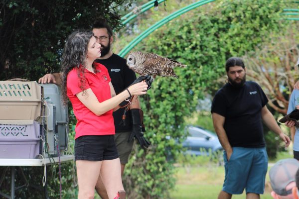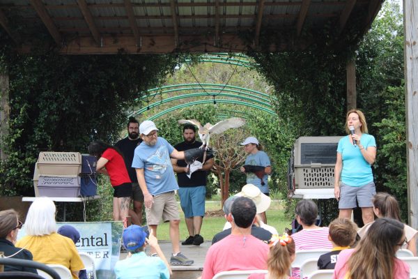 Silent fliers… The worker presents the Bard owl. The Bard owl flies silently and can turn its head about 270 degrees since they cannot move their eyes. (Natalia Noel) Strong bite… The staff member holds the Great Horned owl at the great raptors show. The Great Horned owl is one of the biggest owls in Alabama, and is known to have a bite as strong as a German Shepherd and talons over an inch long. (Natalia Noel) All natural… Frank and Lori Darsey stand in front of their table showcasing their wide selection of all-natural items. The Darseys have been making natural care products for 11 years, starting from the Foley farmers market. “My favorite thing to make is the teas, but we have 55 different items with all natural ingredients,” Darsey said. (Natalia Noel) Critical life… The event grounds display a model of critical nesting areas for different types of birds and their eggs. Many bird eggs hatching grounds get destroyed due to human interference, so this model was displayed to show the importance of leaving them alone. (Natalia Noel) Sea savers… The Alabama Marine Resources table uses marine life figurines to express the dangers that marine animals get saved from everyday. The Alabama Marine Resources division, which is a part of the Alabama Department of Conservation and Natural Resources has been saving marine life since 1915. (Natalia Noel) Native serpents… Alabama State Park staff member holds a Silver Rat snake. Silver Rat snakes, common for being found in forests, swamps and even suburban areas, are native to most of the eastern and southeastern U.S, including Alabama. (Natalia Noel) Taking flight… Nature preserve employee displays the Kite bird. A part of many childhoods, the toy kite was named after this bird because of the similar shapes and flight patterns. (Natalia Noel) Buzztastic creatures… A colony of Honeybees shows the formations of honeycombs and how fresh honey is made. The queen bee facilitates all of the other workers bees in the process of making honey. (Natalia Noel) Taking flight… In this wildlife demo, the Barn Owl spreads its wings . The Barn Owl can have up to 8 babies at once and eat up to 400 mice a month. Barn Owls are found on every continent except for Antarctica because mice do not live there. After a large crowd attended the first Expo event, it should be expected for them to host another. (Natalia Noel)