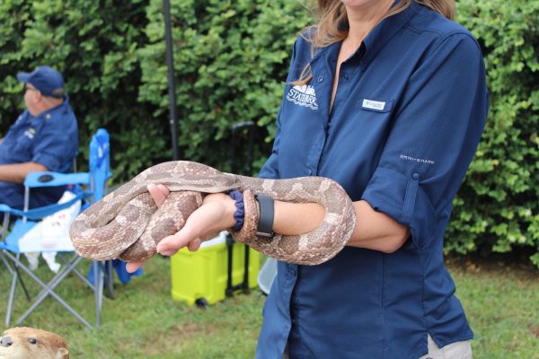 Weeks Bay Nature Preserve staff member holds one of the cornsnakes from the rehabilitation center, Marge. The Gulf Coast Nature Expo took place Oct. 4, at Weeks Bay Plantation to show the public different animals from the wild. (Natalia Noel)